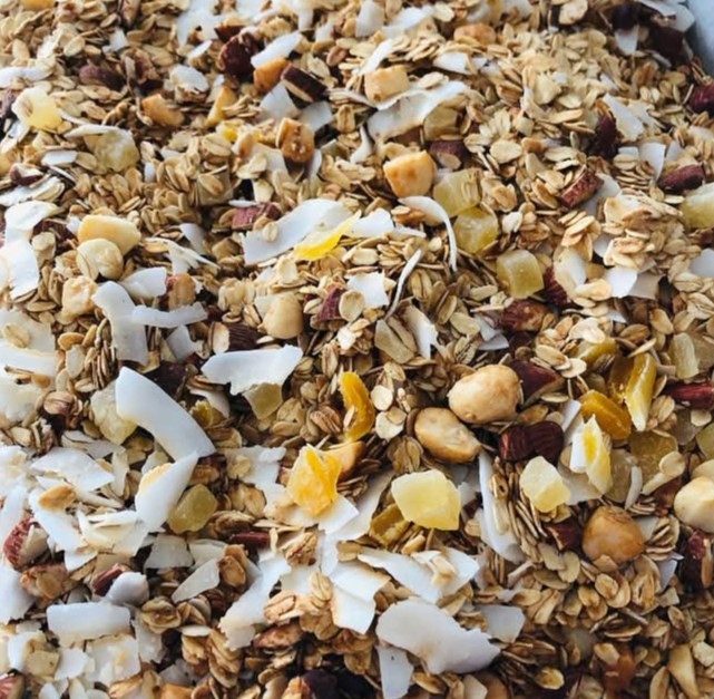 Ingredientes: flocos de aveia, macadâmia, amêndoa, manga, ananás, chips de côco, óleo de côco bio, mel e essência de baunilha.