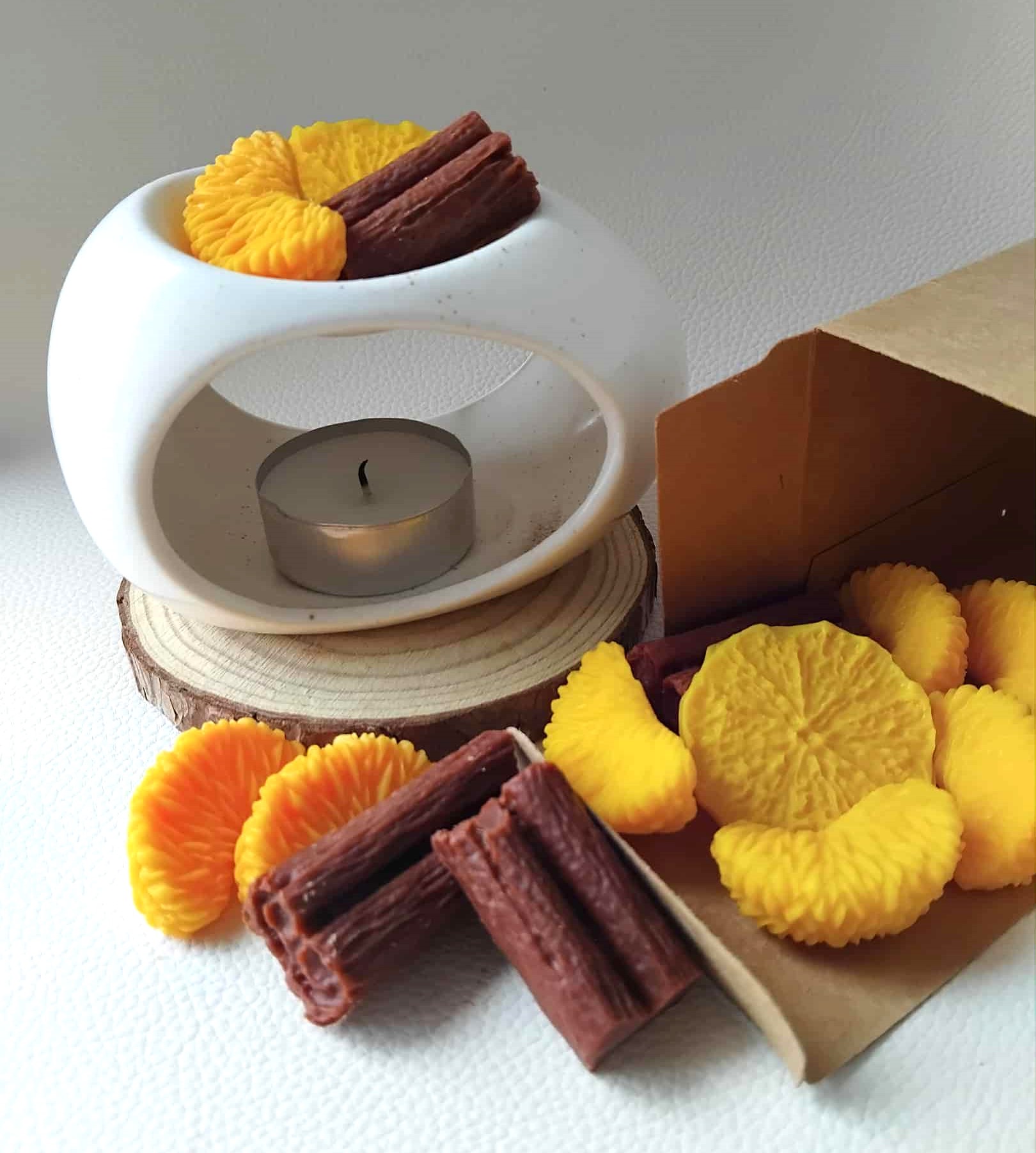 Um kit pensado para transformar o ambiente e o estado de espiríto: difusor + wax melts de "Canela e Laranja".
